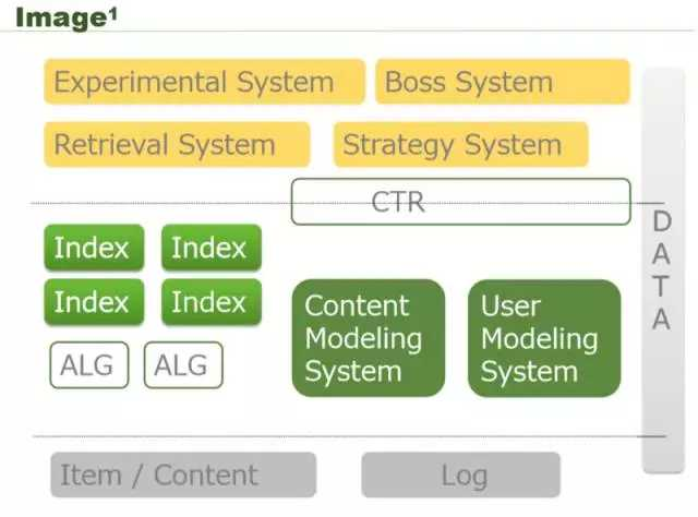 图片的推荐是一个比较宽泛的推荐系统结构,图中黄色部分就是在线服务的实验检索系统,最下面是它的内容和一些流水日志,然后中间是内容建模、用户建模,我们这里最关注的是绿色的部分,就是一个推荐引擎想给用户做推荐,肯定不是一个推荐,比如说有协同固定推荐、兴趣推荐、点击率预估推荐,这些肯定不是一个推荐引擎就够的,因为一个推荐引擎没法做到多样性,所以需要多个推荐引擎并行工作。业内今日头条有 300 多个推荐引擎同时工作,通过流量系统去分流量。如果是图片的话,更多的是关注怎么将图片从底层的 content 检索出来,因为图片没有太多的文字信息,那怎么通过图片检索出相关的文章,相关的内容呢?
