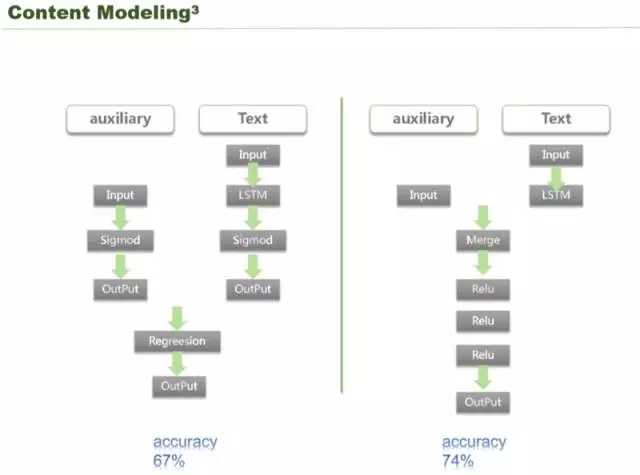 这里又有两个技术,左边是页面的布局、字数、话题热度的信息,还有一些是文本本来的一些描述信息,就是文本的内容的一些信息。这两个信息放到一个网络中很难学出来,因为一个神经网络去学文字特征的时候,比如对所有的 word embeding 都可以,但是像排版布局并不是文字,没有办法同时的做 training,这时候有两个选择,附属的信息用一个模型圈定出来,再把文字的信息用 deep learning、LSTM 圈定出来,圈定出来之后,把这两个输出做一个 regression,就把这两个模型放在一起,这是一个方式。一开始我们这么做的,最后发现我们的准确率只有 67%,说明效果不太好。后面就是把原来的固有信息和文本信息做一个融合,做一个同样的网络,这样整个网络就是 end-to-end,深度学习有一个前向反馈和后向反馈,可以同时同步调整两个网络参数,最后实现的准确率是 74%,这个效果非常好。直接用 kores 深度学习网络框架就可以把传统的一些特征跟文本的特征放在一起进行圈定。