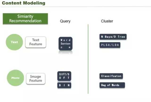 这里我们看一下在文本怎么做的。文本特征可以做 query,可以用字、句做搜索引擎。图像的话,传统的图像有一些算子比如 SIFT,也可以用 query,还有一些可以通过聚类的方式,PLSA 把文章进行聚类,它需要一些特征,还可以通过图片,也是类似通过前面说的一些特征做一些分类技术,这样可以做到一个召回,我这张图的 index,这其实都是可以召回的。