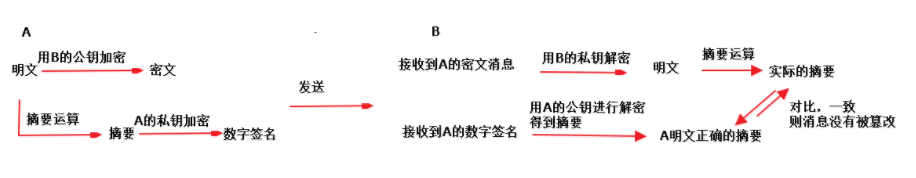 B:用A公共密钥对数字签名解密(这里保证了只有A的身份),同时对收到的密文使用自己的私钥解密,在用SHA编码加密产生又一摘要。将解密后的摘要和用SHA编码加密产生的又一摘要相互对比。如两者一致,则说明传送过程中信息没有被破坏或篡改过(这里保证了数据的完整性)。