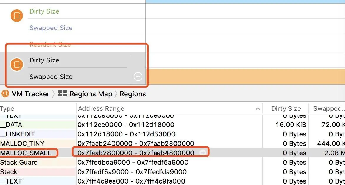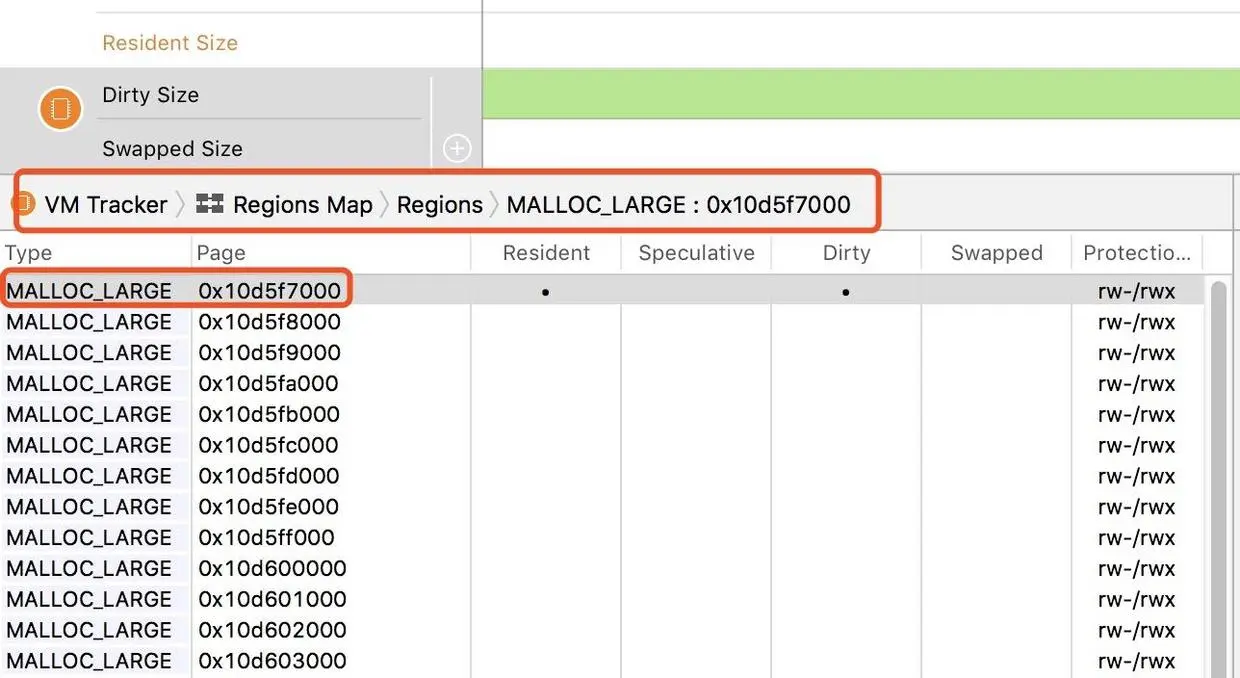 第一个地址是0x7faab2800000。我们切换到最底下的VM Track,将模式调整为Regions Map。