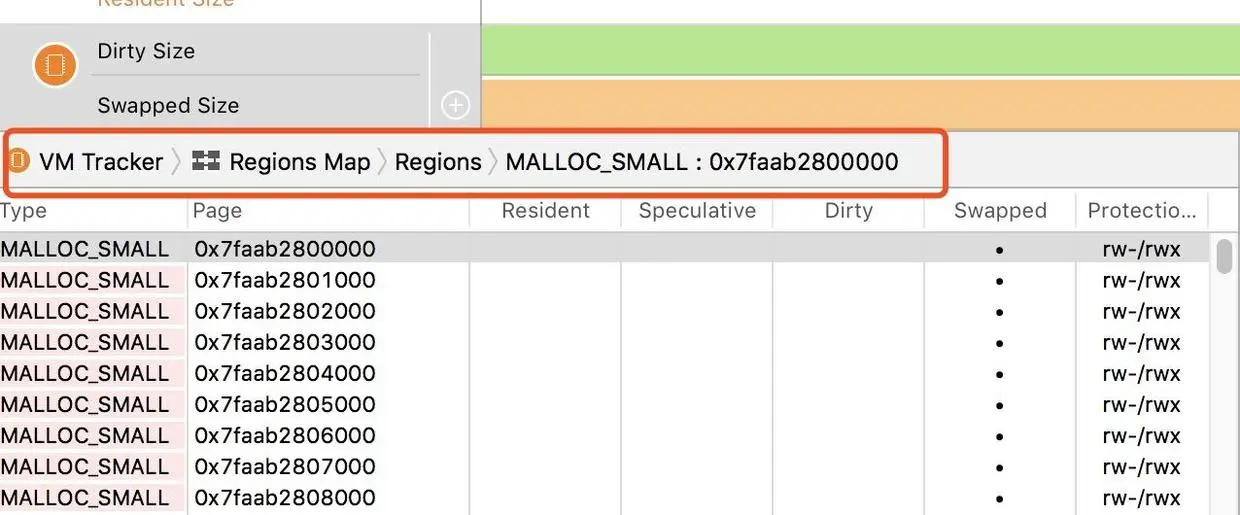 然后找到Address Range为0x7faab2800000开头的Region,我们发现这个Region的Type是MALLOC_SMALL。点击箭头看详情,你将会看到这个Region中的内存页列表。