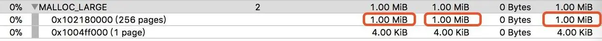现在Resident Size,Dirty Size也是1M了,说明这块内存已经被映射到物理内存中去了。为了解决这个问题,苹果官方推荐使用calloc代替malloc,calloc返回的内存区域会自动清零,而且只有使用时才会关联到物理内存并清零。