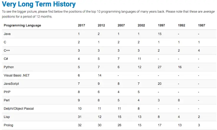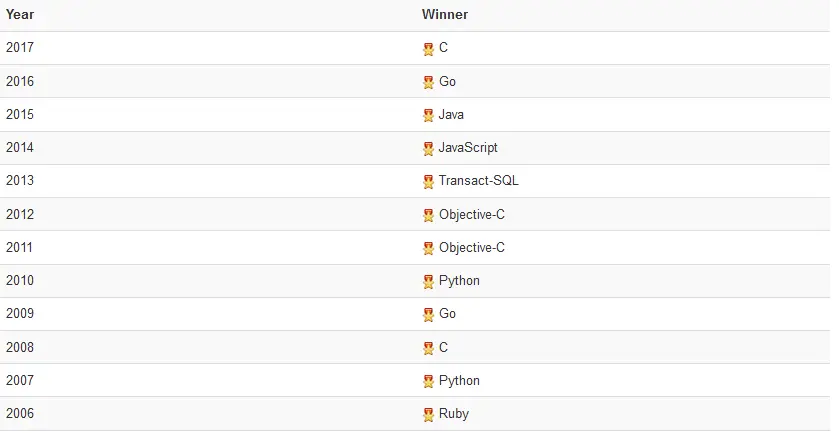 查看 TIOBE 排行榜,我们会发现,排名靠前的一直都是那几门编程语言,变化不会很大。我们可以来看看近几年的年度编程语言:C(2017),Go(2016),Java (2015),JavaScript (2014)