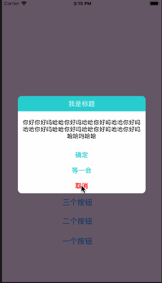 PTLAlertView *alertView = [[PTLAlertView alloc]initWithTitle:@"我是标题" message:@"你好你好吗哈哈你好吗哈哈你好吗哈哈你好吗哈哈你好吗哈哈你好吗哈哈你好吗哈哈你好吗哈哈吗哈哈你好你好吗哈哈你好吗哈哈你好吗哈哈你好吗哈哈你好吗哈哈你好吗哈哈你好吗哈哈你好吗哈哈吗哈哈你好你好吗哈哈你好你好吗哈哈你好吗哈哈你好吗哈哈你好吗哈哈你好吗哈哈你好吗哈哈你好吗哈哈你好吗哈哈吗哈哈" cancelButtonTitle:@"取消" otherButtonTitles:@"确定",@"等一会", nil];