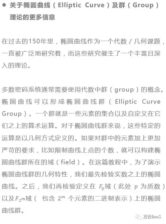 技术干货 | 椭圆曲线加密教程【上篇】 万云WANCLOUD 2018-01-18 354 阅读1分钟 译者:王建/蔡佳慧译者介绍:译者注:椭圆曲线算法是区块链技术的基础。但是,目前网络上很多区块链技术文档对椭圆曲线的讲解语焉不详。本文对椭圆曲线讲解层层递进,易于理解。读完这篇文章,再去看具体曲线,比如secp256k1,就会容易理解了。注:由于本文较长,故分成了上篇与下篇。本文为万云BasS编译,未经允许不可转载欢迎关注万云公众号,获取关于区块链技术更多干货!