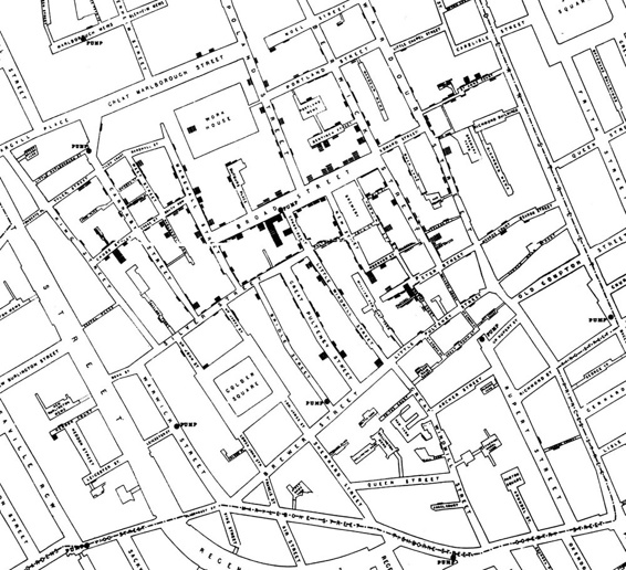 1854 年 8 月底,霍乱在过度拥挤的伦敦苏豪区爆发。随着死亡人数的增加,斯诺用一种在疾病传播研究中成为标准的方法,勤奋地将它们记录下来:他画了一张地图。在该地区的街道地图上,他记录了每次死亡的地点。