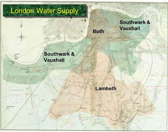 斯诺为自己在 Soho 中学到的东西感到鼓舞,他对霍乱的死亡情况做了更彻底的分析。一段时间中,他一直在收集伦敦一个地区的数据,这里由两家水厂服务。Lambeth 水厂从污水排入泰晤士河的地方的上游抽水。它的水比较干净。但 Southwark and Vauxhall (S&V) 公司在污水排放的下游抽水,因此其供水受到污染。