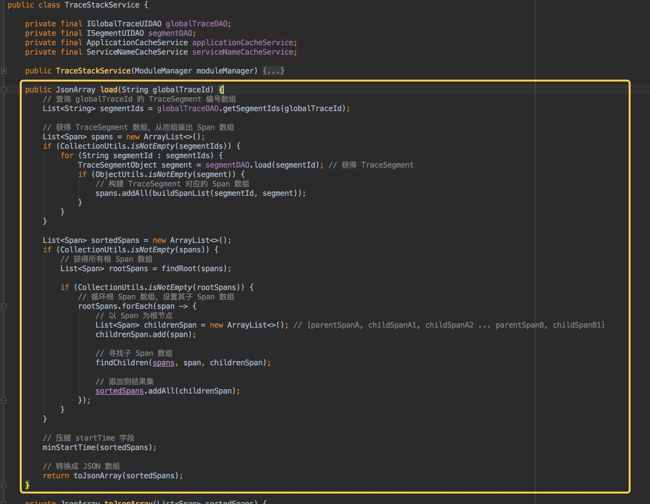 TraceStackService#load(globalTraceId)方法,基 GlobalTrace 和 Segment 表,获取一次分布式链路追踪记录详情的逻辑处理器。逻辑较为繁琐,笔者已经添加注释,胖友调试一下,很容易明白滴。