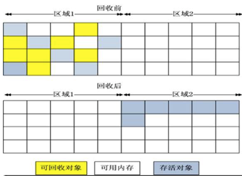 “复制”(Copying)的收集算法,它将可用内存按容量划分为大小相等的两块,每次只使用其中的一块。当这一块的内存用完了,就将还存活着的对象复制到另外一块上面,然后再把已使用过的内存空间一次清理掉。