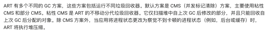 ART 有多个不同的 GC 方案,这些方案包括运行不同垃圾回收器。默认方案是 CMS。