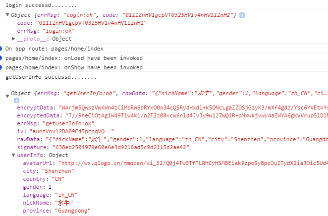 通过上面wx.login和wx.getUserInfo两个api拿到相应的信息,并通过上方接口传给自己的服务器.