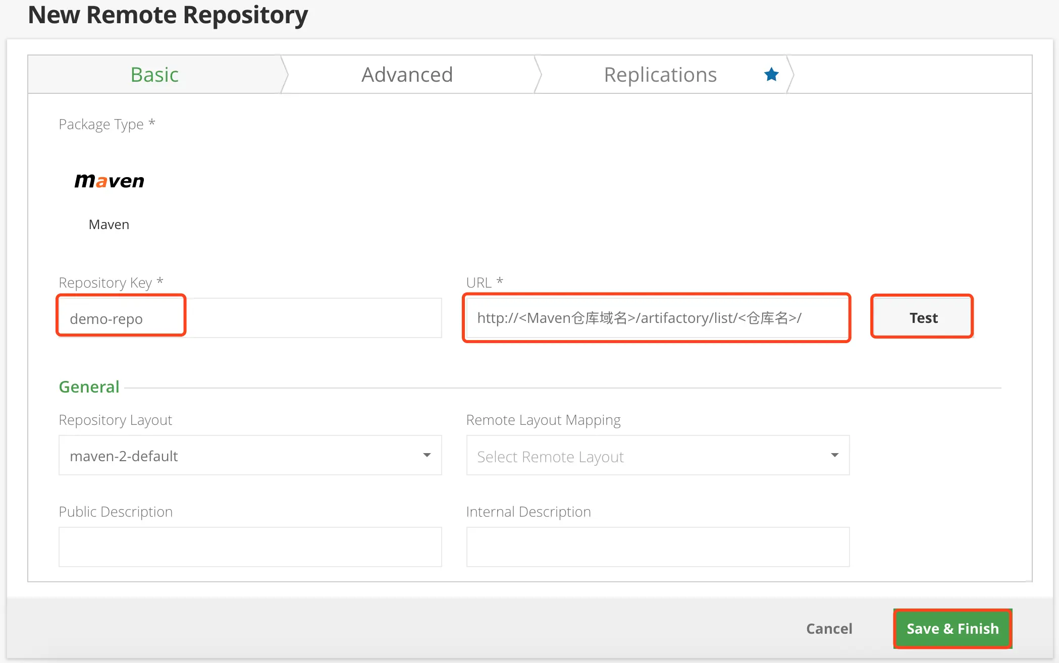URL地址填写完成后,可以点击 Test 按钮测试连接的有效性,如果连接有效可以点击 “Save & Finish” 按钮完成创建。