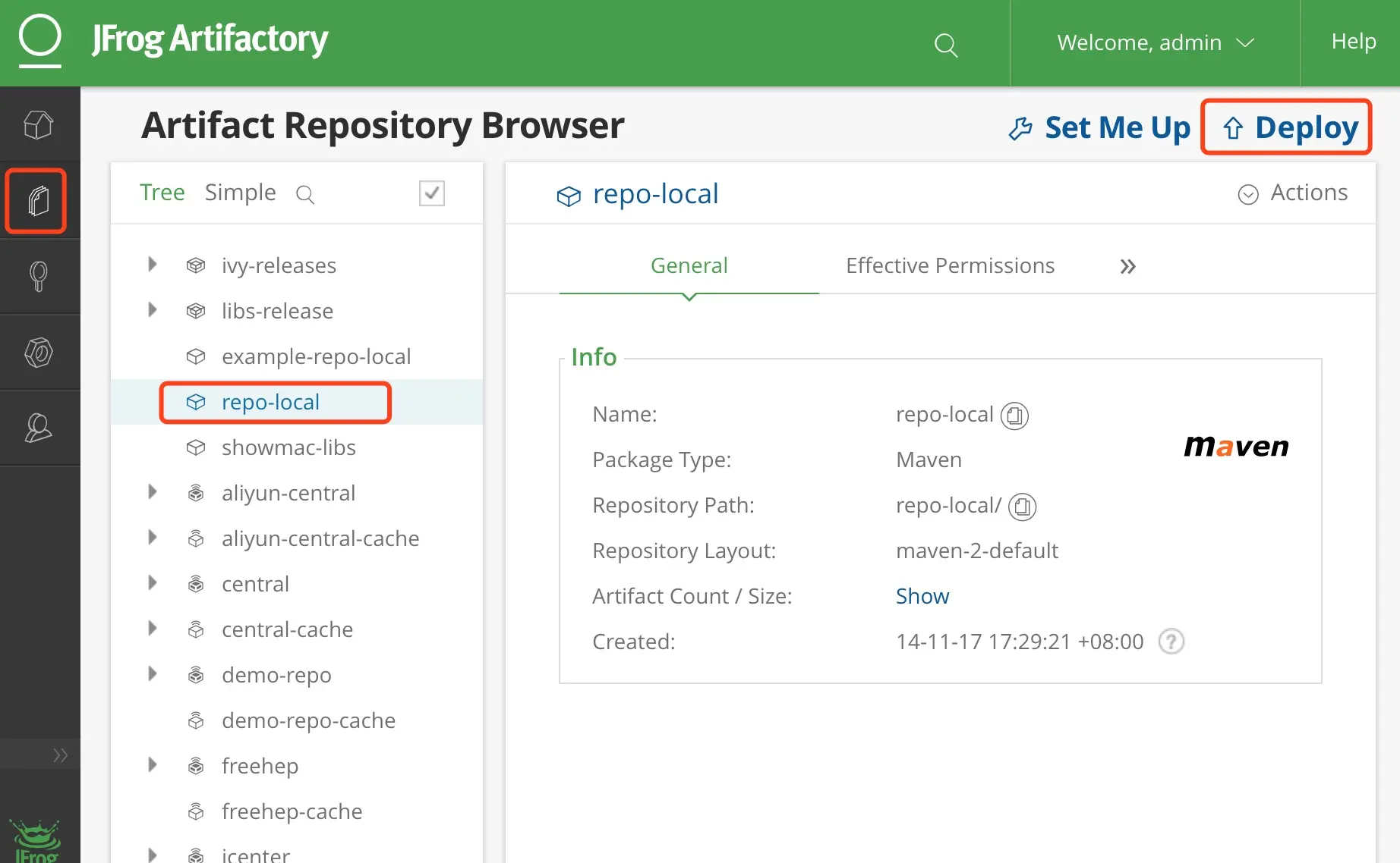 **Repository Key:**仓库的名称,不能与其他仓库重名,示例的仓库名为: demo-repo