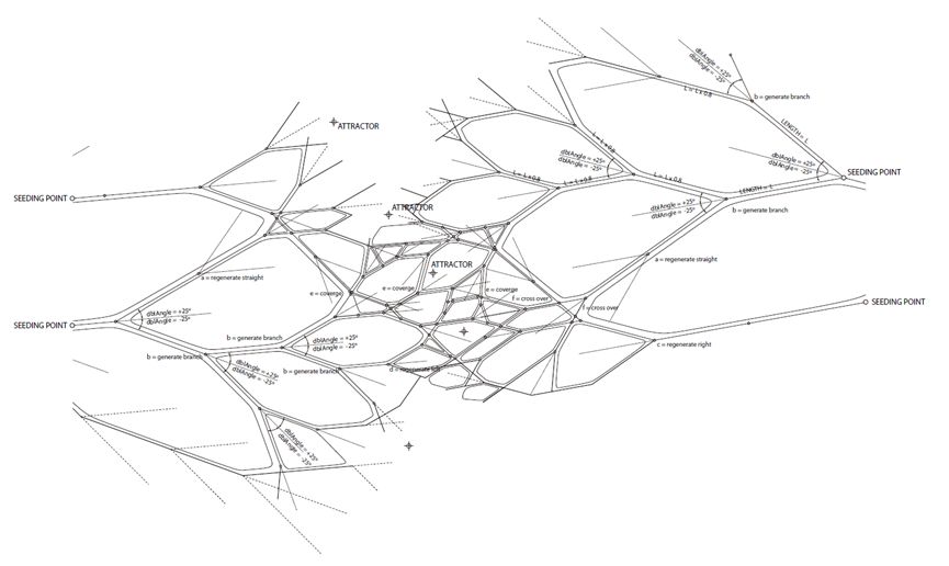 自然界树干的形态中存在着潜在的结构合理性。通过模拟树干的形态,设计者希望在突出方案表现力的同时,兼顾一定的力学性能和经济性。设计者选取了一定的种子点和吸引力,让“树干”从各种子点按照一定的规则生长、分叉、转向、相交和终止,最后得到了有趣的表皮与结构形式。