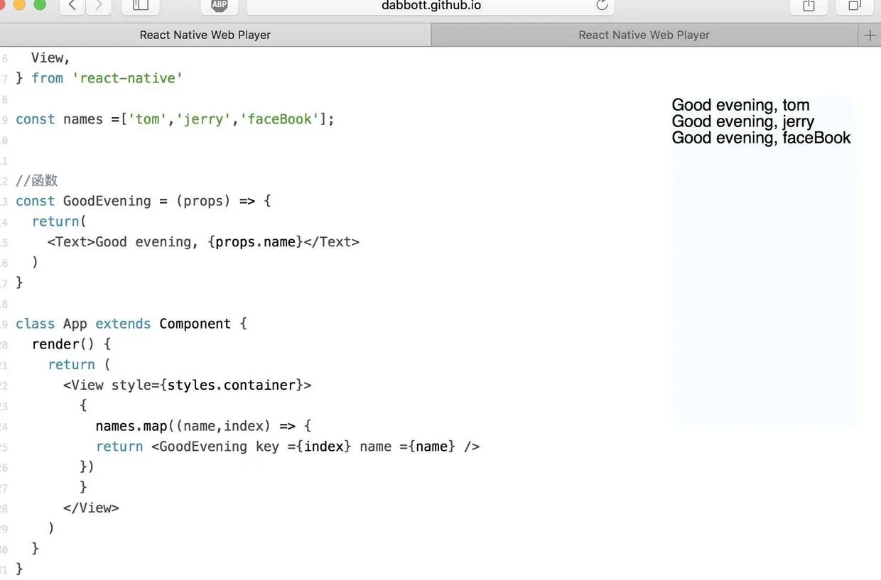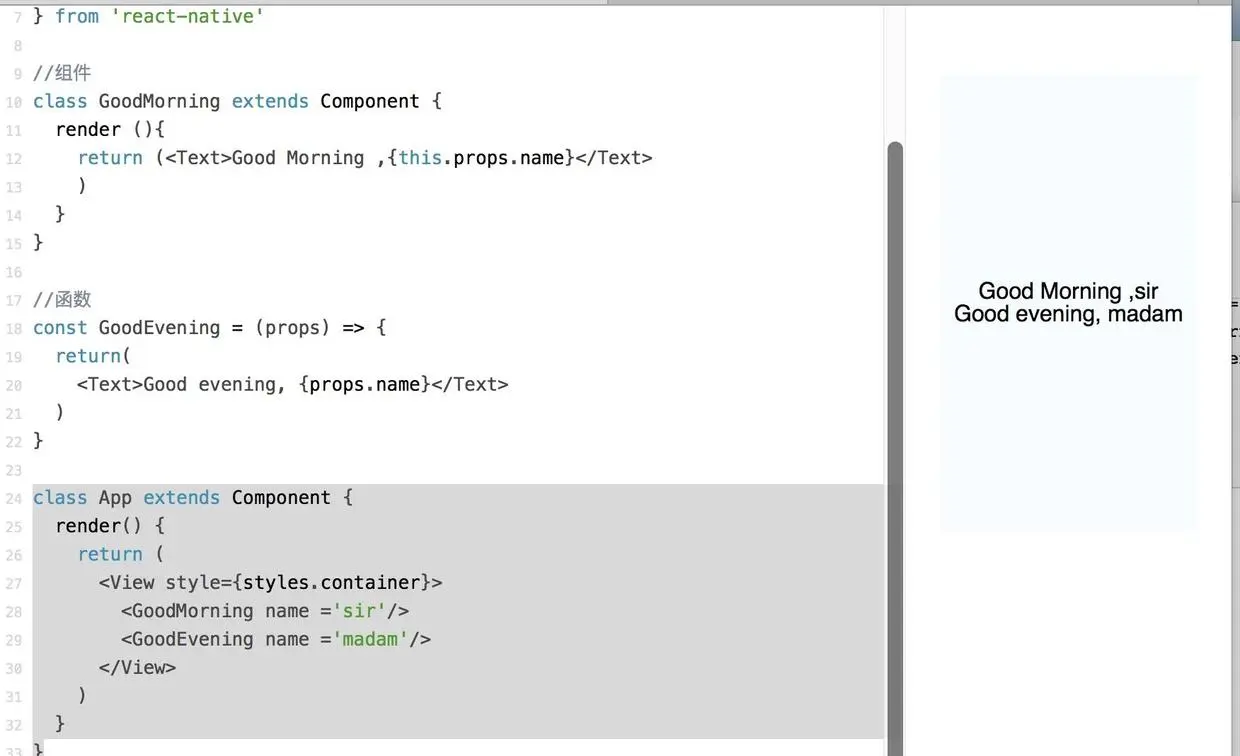 class GoodMorning extends Component { render() { return ( <View style={styles.container}> <Text>Good morning</Text> </View> ); } } const GoodEvening = () => { return <Text> GoodEvening </Text> } class App extends Component { render() { return ( <View style={styles.container}> <GoodMorning /> <GoodEvening /> </View> ) } } -