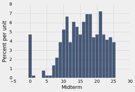scores_and_sections.select('Midterm').hist(bins=np.arange(-0.5, 25.6, 1))