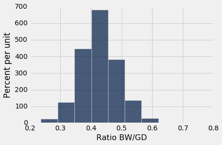 我们将首先定义一个函数bootstrap_proportion,返回一个自举样本的比例的数组。 我们再一次通过编辑bootstrap_median的定义来实现它。 计算中唯一的变化是用二次样本的吸烟者比例代替中位数。 该代码假定数据列由布尔值组成。 其他的改变只是数组的名字,来帮助我们阅读和理解我们的代码。