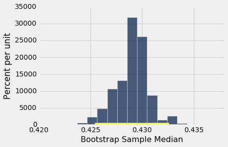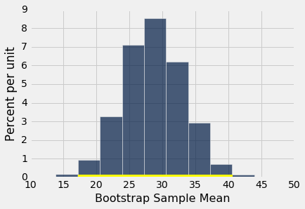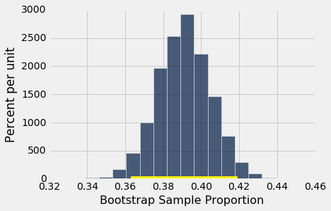 让我们使用bootstrap_proportion来构建总体的母亲吸烟者百分比的 95% 置信区间。 该代码类似于均值和中位数的相应代码。