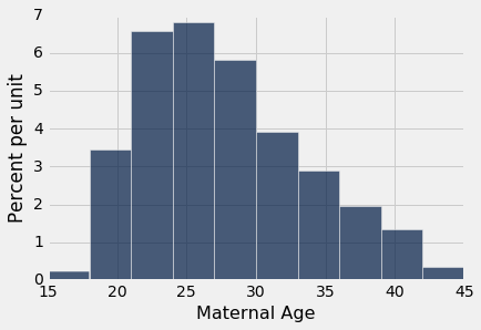 克制住将置信区间用于其他目的的冲动,这很重要。例如,回想一下,我们计算了区间(26.9 yr, 27.6 yr),作为母亲平均年龄的约 95% 的置信区间。区间的一个令人惊讶的常见误用是得出这样的结论,约 95% 的女性在 26.9 岁至 27.6 岁之间。你不需要怎么了解置信区间,来查看这是不是正确的 - 你不会预计 95% 的母亲的年龄在这个较小的范围内。实际上,抽样年龄的直方图显示出相当多的变化。