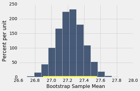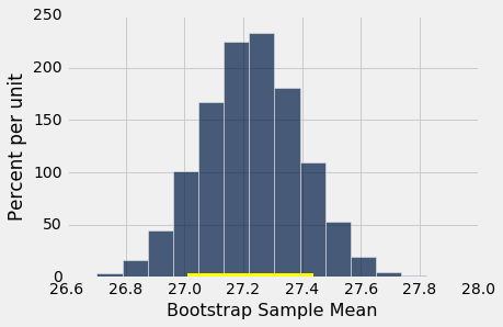 抽样年龄的一小部分在(26.9, 27.6)的区间内,你可能会预计总体中的百分比很小。 区间只是估计一个数字:总体中所有年龄的平均值。