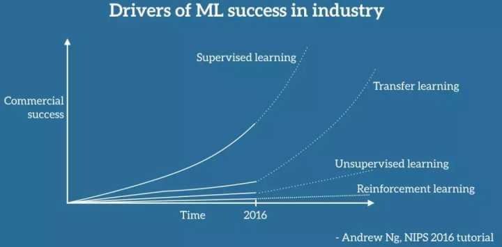 毋庸置疑,迄今为止机器学习在行业中的使用和成功主要是由监督学习推动的。 在深度学习的进步、功能更强大的计算工具和大型标记数据集的推动下,监督学习已经重新激发了人们对人工智能的兴趣、融资和收购的浪潮,特别是近几年来,我们已经看到机器学习的应用成为我们日常生活的一部分。 如果我们无视那些反对者和另一个 AI 冬季的预兆,而是相信 Andrew Ng 的预见,这样的成功可能会继续下去。