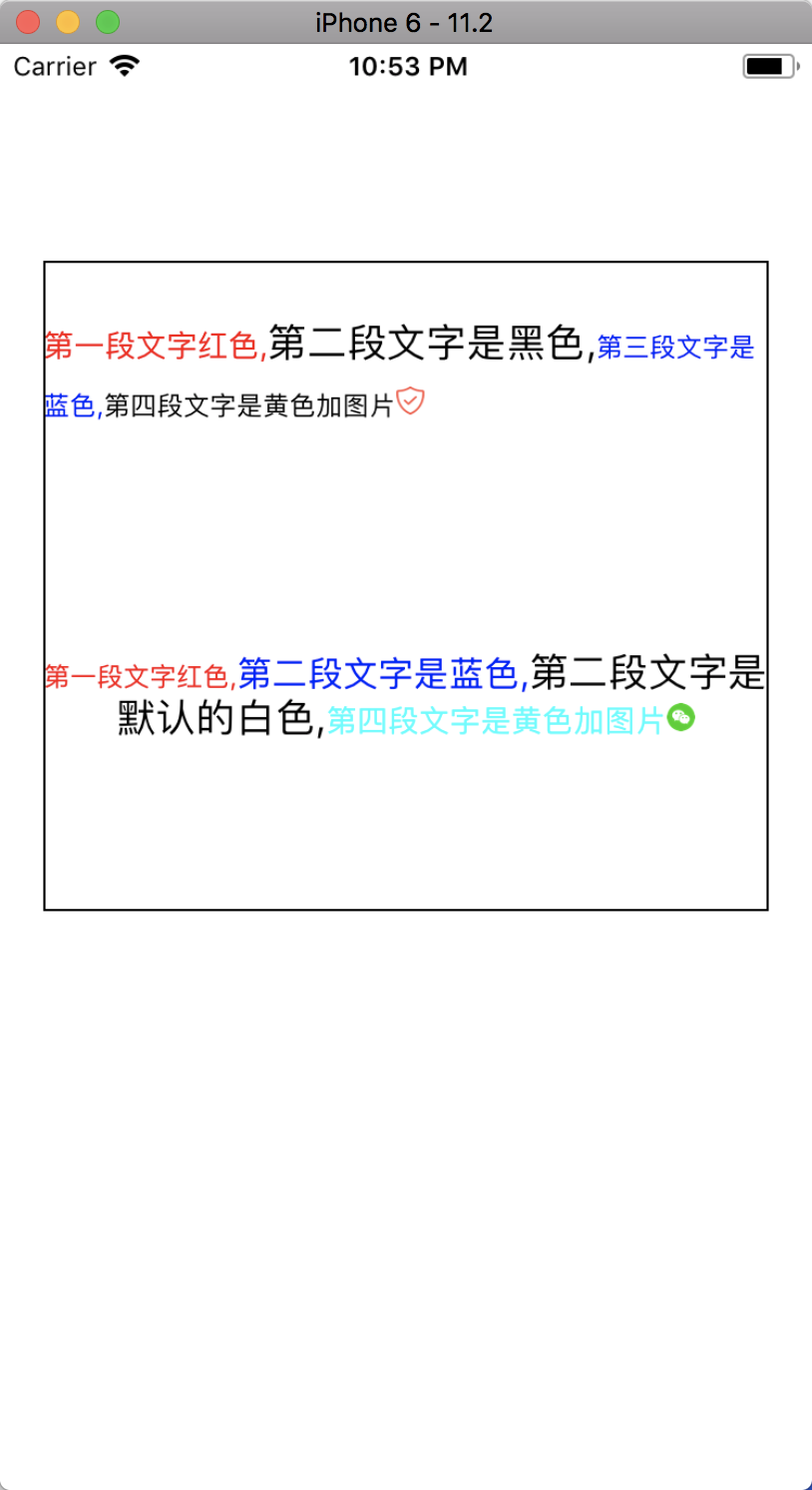 @{@"font":[UIFont systemFontOfSize:14],@"text":@"第四段文字是黄色加图片",@"attach":[UIImage imageNamed:@"t4_share_icon_weixin"],@"color":[UIColor cyanColor]}