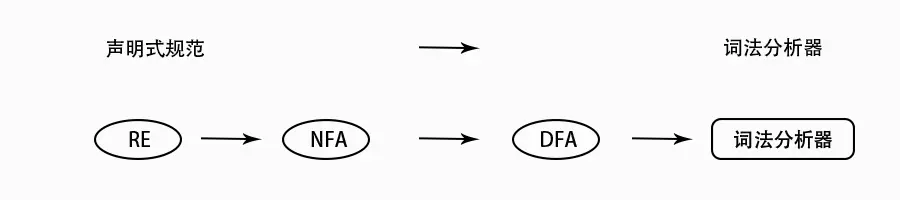 简短回顾正则引擎工作流程,接受一条声明式的规范(正则表达式),通过词法分析自动生成器,生成词法分析代码。如下图所示,自动生成器将正则表达式变成 NFA,再转换成 DFA 数据结构(DFA引擎),再到词法分析算法代码。