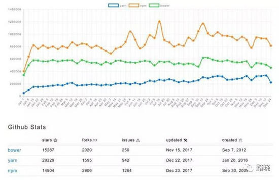 Bower 市场占有率持续下降,它的最后一次发布在2016年11月,之后官方正式推荐用户使用 NPM 用于管理前端项目中的软件包。