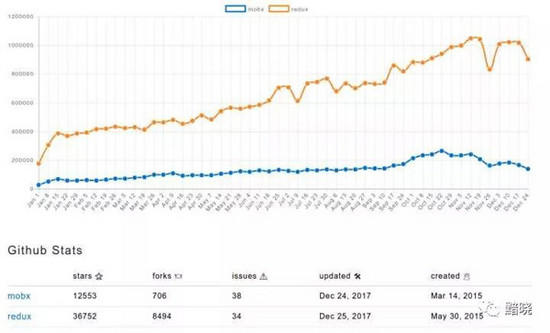 Redux 仍然作为 React 项目推荐的状态管理解决方案,并在 2017年获得了五倍的增长速度(NPM 下载量)。