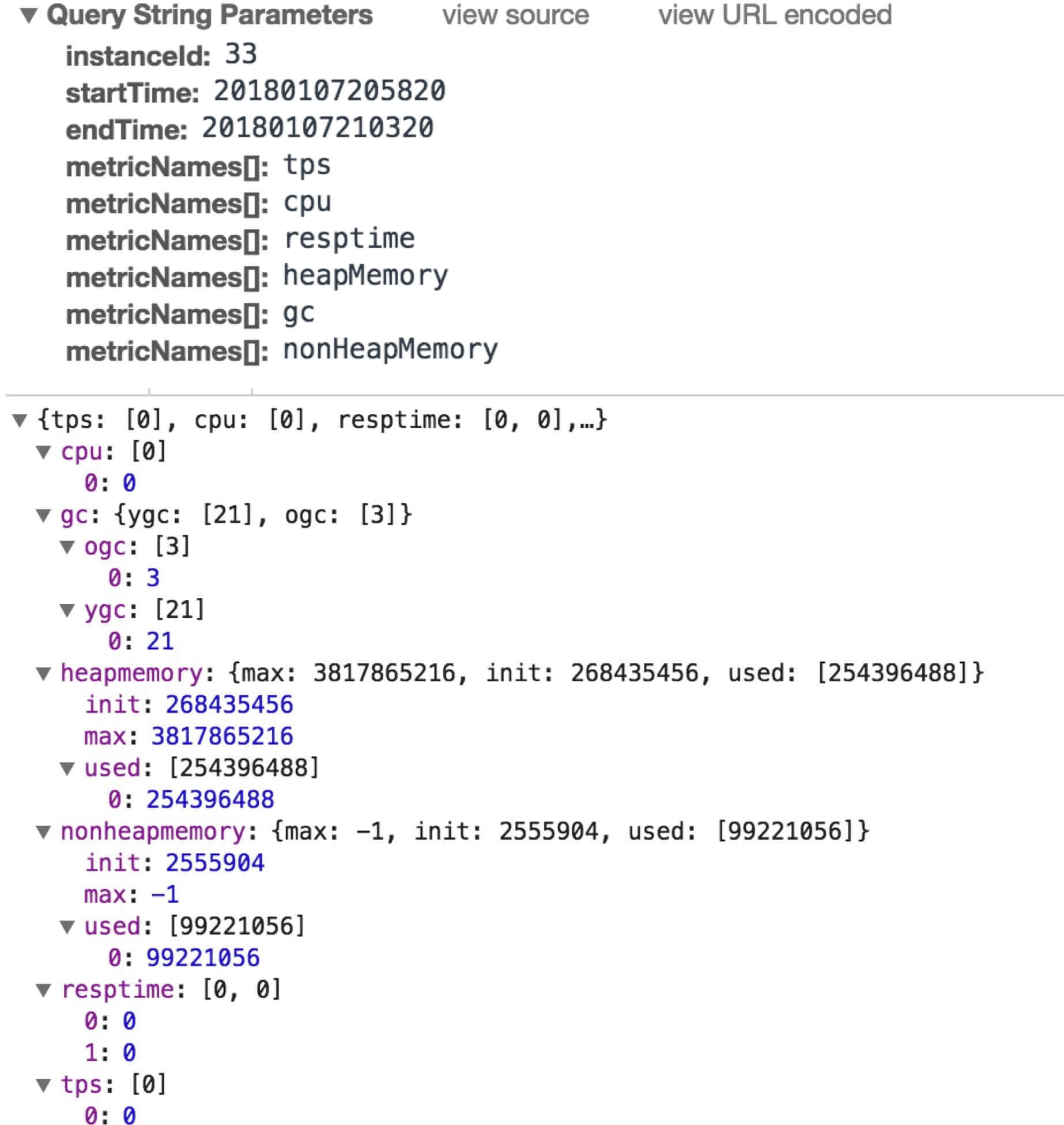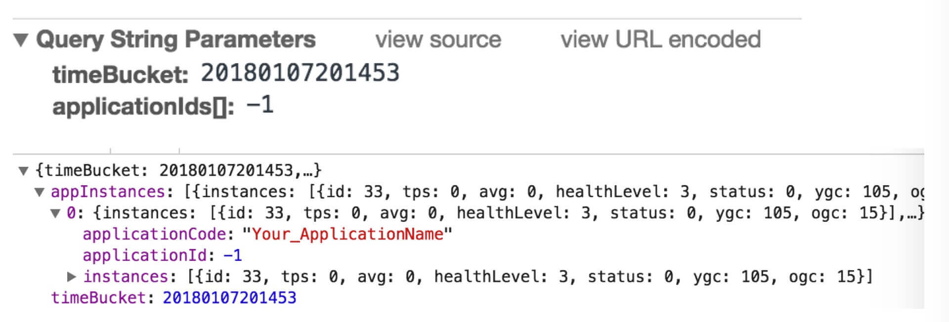 - 红色部分,时间进度条,调用 「2. AllInstanceLastTimeGetHandler」 接口,获得应用实例最后心跳时间。大多情况下,我们进入该界面,看的是从最后心跳时间开始的应用调用情况。