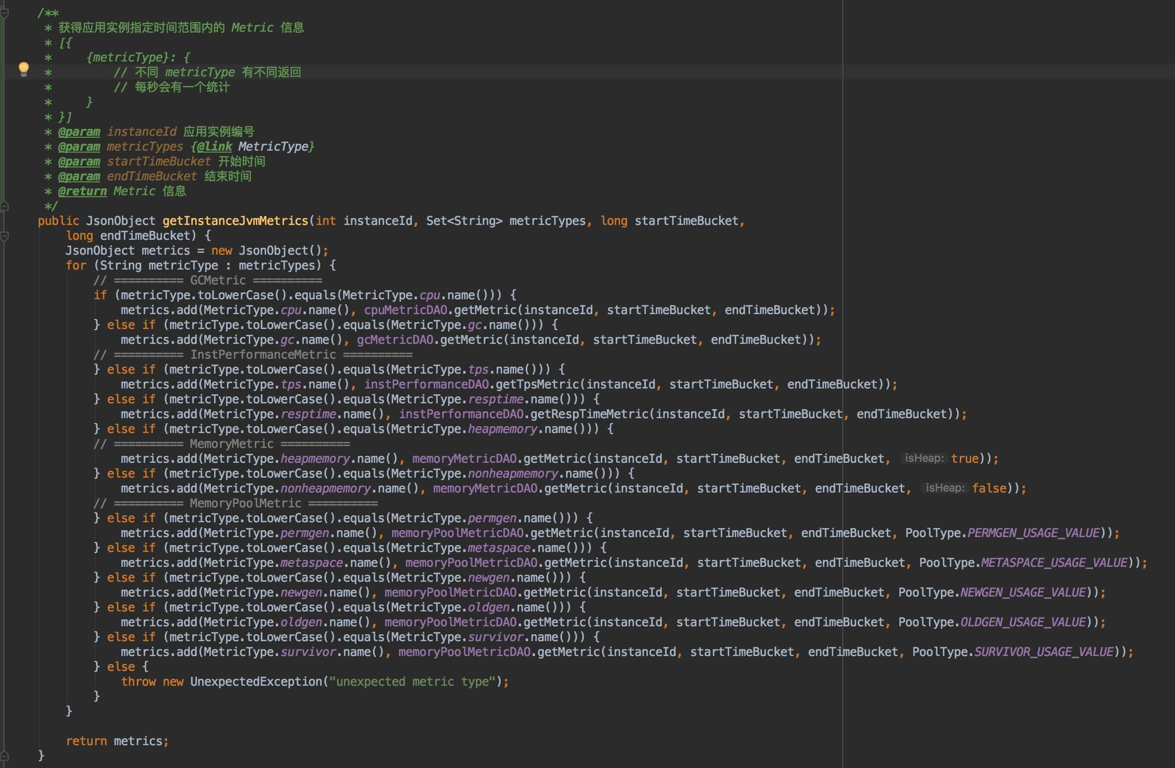 InstanceJVMService#getInstanceJvmMetrics(instanceId, metricTypes, startTimeBucket, endTimeBucket)方法,获得应用实例指定时间范围内的 Metric 信息,涉及 GCMetric 、InstPerformanceMetric 、MemoryMetric 、MemoryPoolMetric 数据表。代码比较简单易懂( 笔者太懒了 ),胖友自己阅读理解。