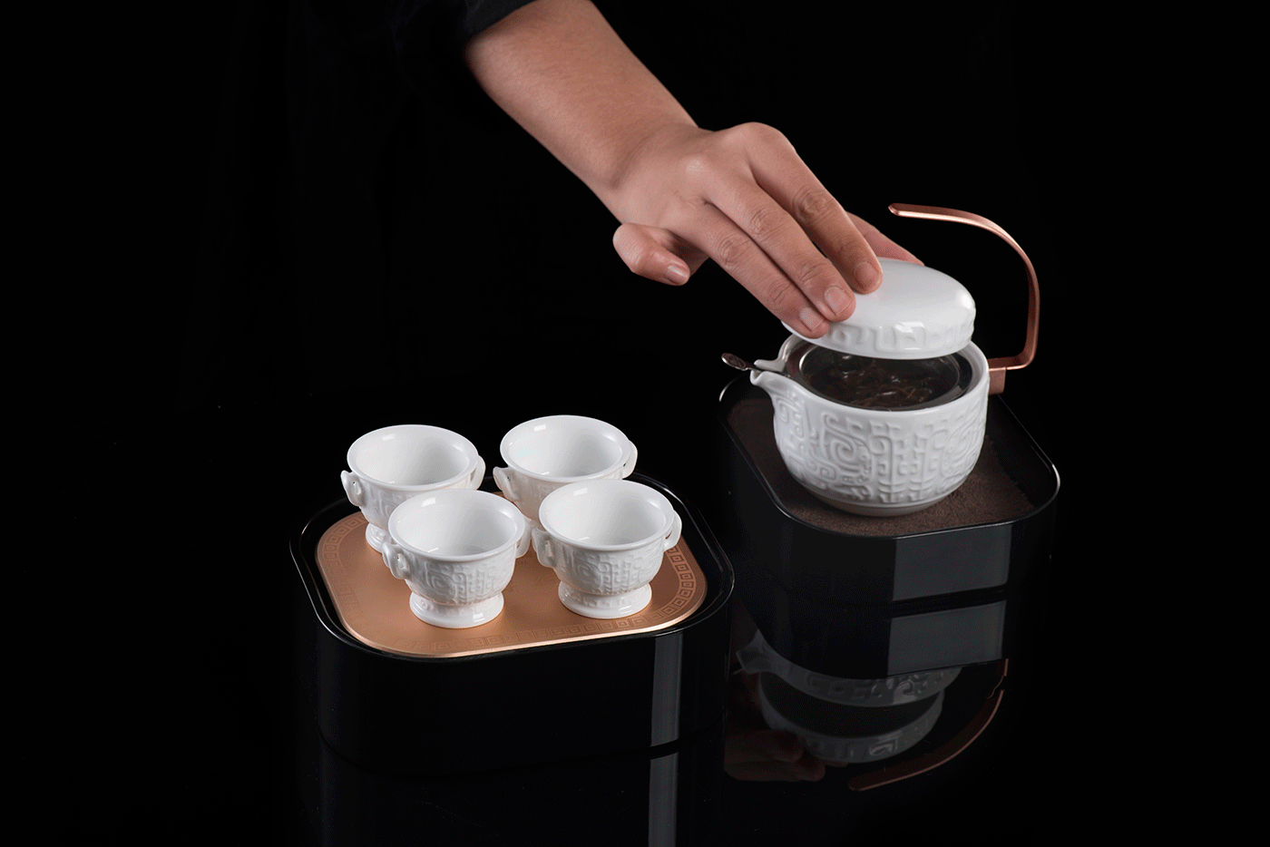 茶盒内装有四杯,取出茶杯,放置于茶盘上,