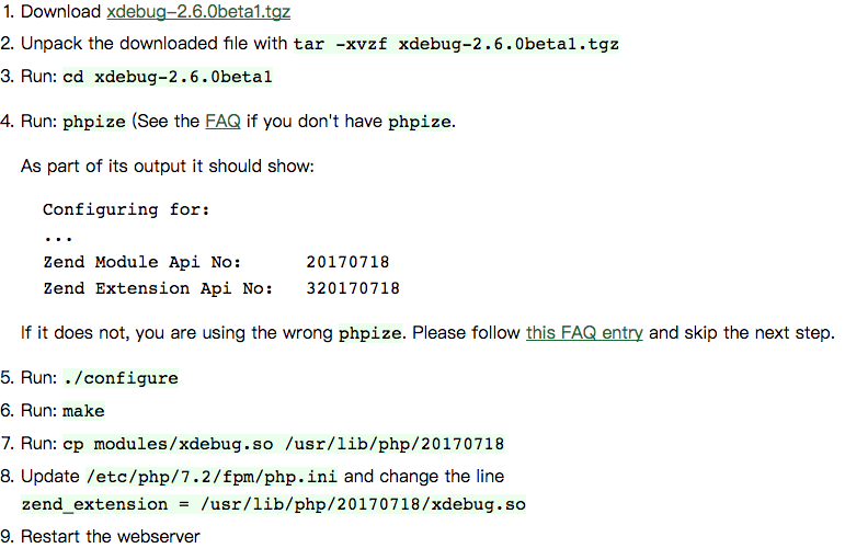 Xdebug官方提供了一个检测工具,只需要提供phpinfo()的信息,就可给你一个详细的xDebug安装步骤。页面地址:xdebug.org/wizard.php;