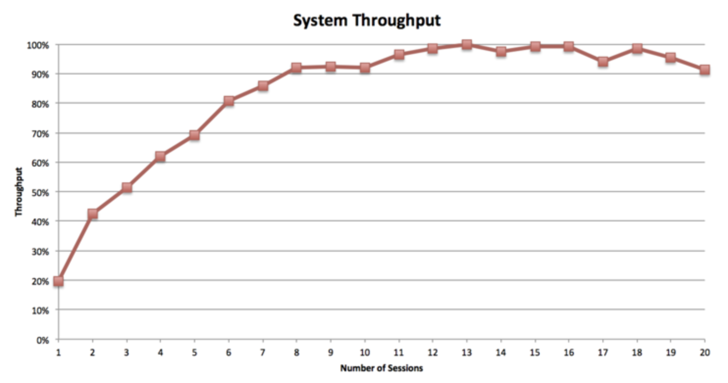 MPP和批处理方案如MapReduce之间有一个更重要的不同就是并发度。并发度就是同一时刻可以高效运行的查询数。MPP是完美对称的,当查询运行的时候,集群中每个节点并发的执行同一个任务。这也就意味着MPP集群的并发度和集群中节点的数量是完全没有关系的。比如说,4个节点的集群和400个节点的集群将支持同一级别的并发度,而且他们性能下降的点基本上是同样。下面是我所说情况的一个例子。