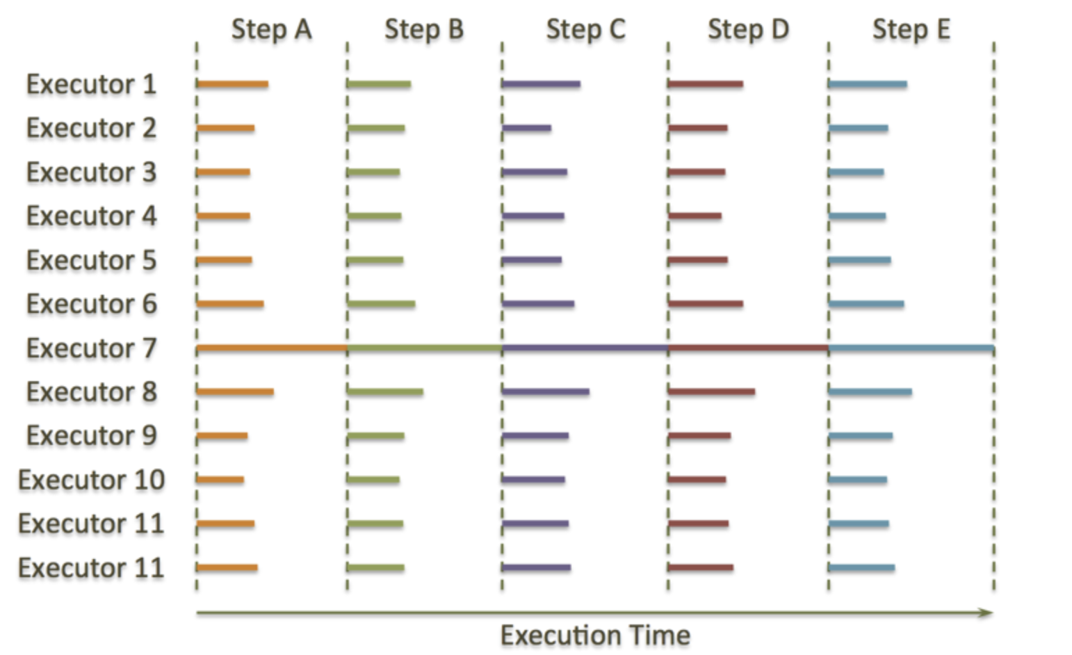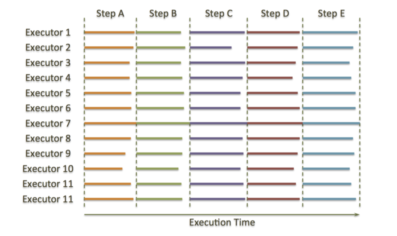 但是,这样的设计对于所有的MPP解决方案来说都有一个主要的问题——短板效应。如果一个节点总是执行的慢于集群中其他的节点,整个集群的性能就会受限于这个故障节点的执行速度(所谓木桶的短板效应),无论集群有多少节点,都不会有所提高。这里有一个例子展示了故障节点(下图中的Executor 7)是如何降低集群的执行速度的。