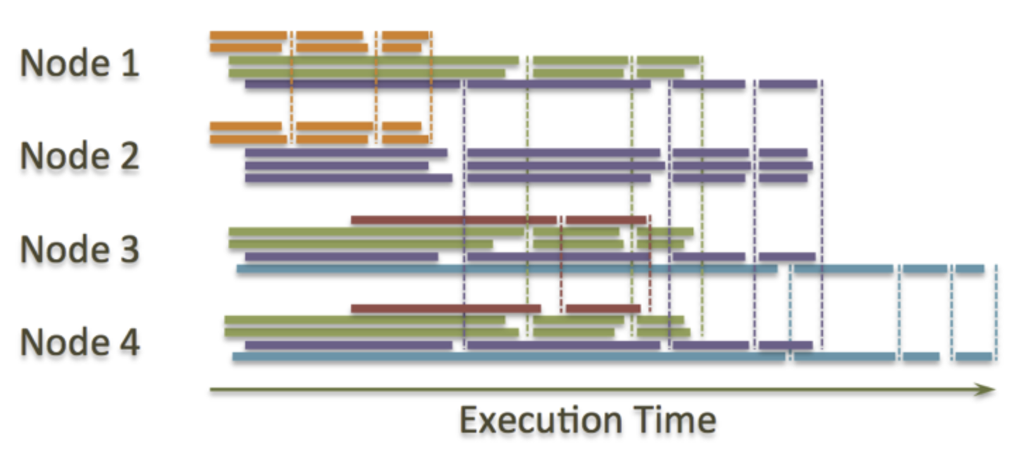 大多数情况下,除了Executor 7 其他的所有执行器都是空闲状态。这是因为他们都在等待Executor 7执行完成后才能执行同步过程,这也是我们的问题的根本。比如,当MPP系统中某个节点的RAID由于磁盘问题导致的性能很慢,或者硬件或者系统问题带来的CPU性能问题等等,都会产生这样的问题。所有的MPP系统都面临这样的问题。