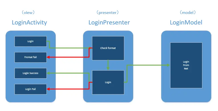 如登录方法,登录返回后,在回调中得到数据,也可以再进行一些逻辑判断,将结果交给view的对应的方法。