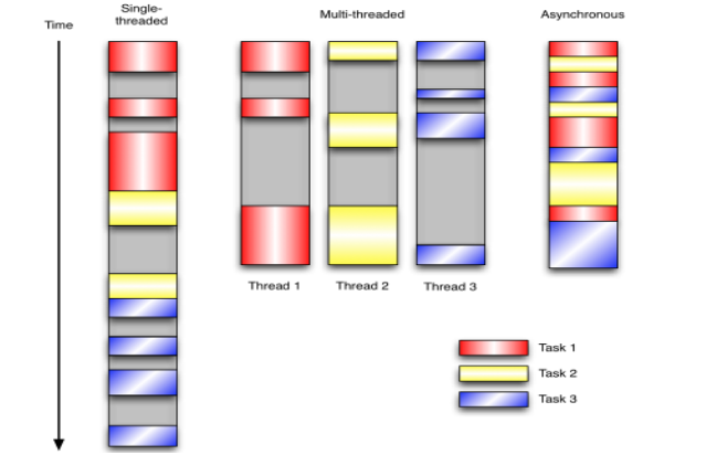 让我们用例子来比较和对比一下单线程、多线程以及事件驱动编程模型。下图展示了随着时间的推移,这三种模式下程序所做的工作。这个程序有3个任务需要完成,每个任务都在等待I/O操作时阻塞自身。阻塞在I/O操作上所花费的时间已经用灰色框标示出来了。