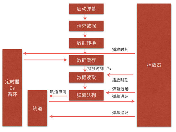 在弹幕启动之后,首先要检查本地是否已有缓存数据,没有的话直接请求数据并缓存,然后执行数据读取,首次过滤数据进入弹幕队列,同时启动定时器。弹幕队列的数据会定期请求轨道,检测队列里的弹幕是否可以进入,一旦确认后轨道做好登记,弹幕就可以进入播放器开启动画播放了。定时器每隔2秒就会再次更新数据进入到弹幕队列(这块不同的业务可以定制不同的规则)。弹幕播放结束后会通知调度和轨道,调度会在弹幕队列中移除该弹幕实例,轨道也会移除该弹幕实例的轨道占用。