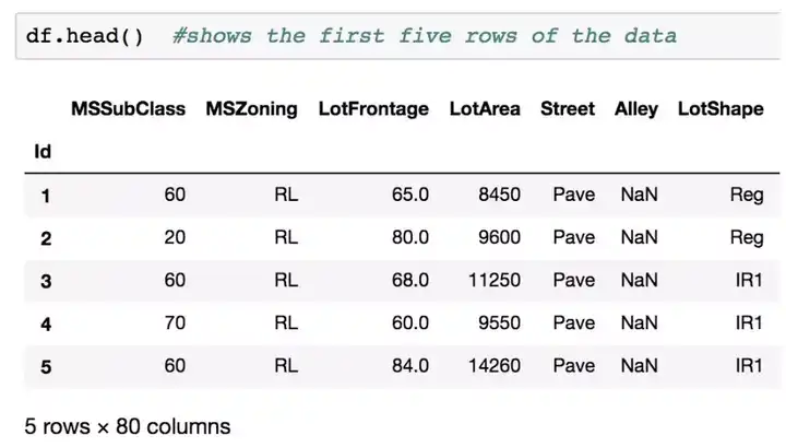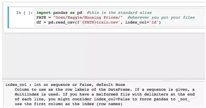 最后一行使用了 Python 3.6 的字符串格式将从 Kaggle 下载的 CSV 文件(『comma-separated-values』,一种常用格式,可使用任何标准软件打开,例如 Excel)加载到 Pandas DataFrame 中。我们之后将频繁使用 read_csv,因此建议先浏览它的文档(这是一个好习惯)。加载数据并查看 DataFrame,可以发现数据集中的第一列是 Id,代表数据集中该行的索引,而不是真实观察值。因此,我修改了代码,加上 index_col=『Id』作为参数,从而在加载数据到 DataFrame 的时候,确保 Pandas 将其作为索引而不是列,并在它之前添加一个新的索引列。