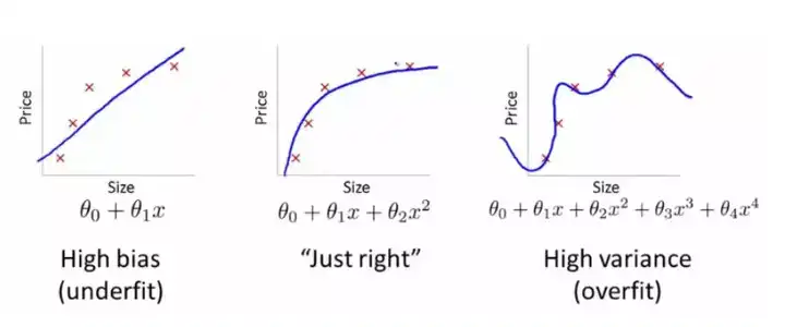 如果模型没有充分拟合训练数据,它将会有高偏差(通常称为欠拟合),因此它的训练误差较大。然而,如果模型过于拟合训练数据,它会捕捉到变量之间的特殊关系(偶然的),导致高方差(通常称为过拟合),因此它的测试误差较大。所以,我们需要在偏差和方差之间进行权衡。