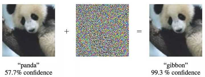 ▲ 左边是原图,中间是“扰动滤镜”,在右边是最终的成品图像(图源:Goodfellow,Jonathon Shlens, and Christian Szegedy)AI一开始认为图片有57.7%的可能性是熊猫,经过扰动之后,它觉得这张图绝对是长臂猿(熊猫辣么萌和长臂猿哪点像了???)