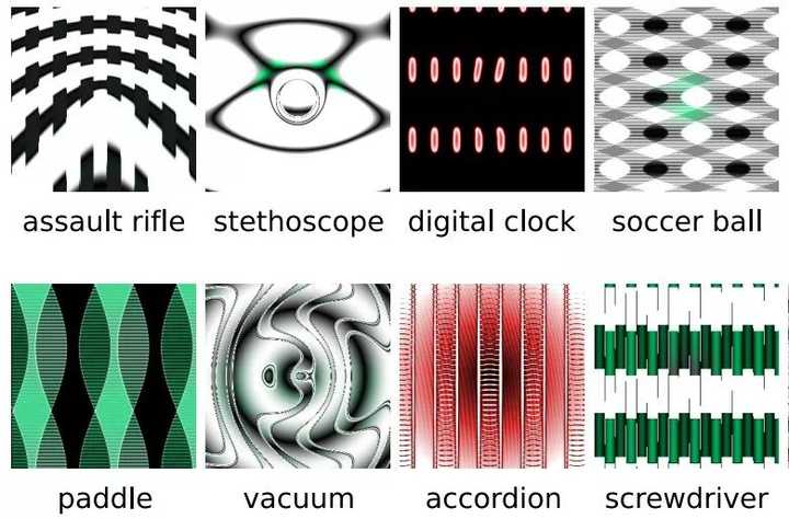 ▲ 一些欺诈图像和AI眼里的图像(图源:JeffClune, Jason Yosinski, Anh Nguyen),从左上到右下分别是冲锋枪、听诊器、数字时钟、足球、船桨、真空吸尘器、手风琴、起子。别说,只要摘下近视眼镜看,还真有那么点意思……