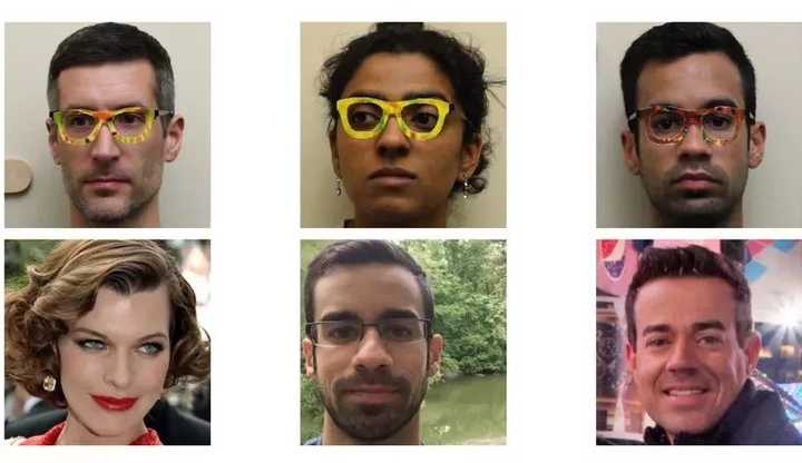 ▲ 上面是戴着眼镜的测试者,下面是电脑识别出来的人脸(图源:MahmoodSharif, Sruti Bhagavatula, Lujo Bauer, and Michael K. Reiter)