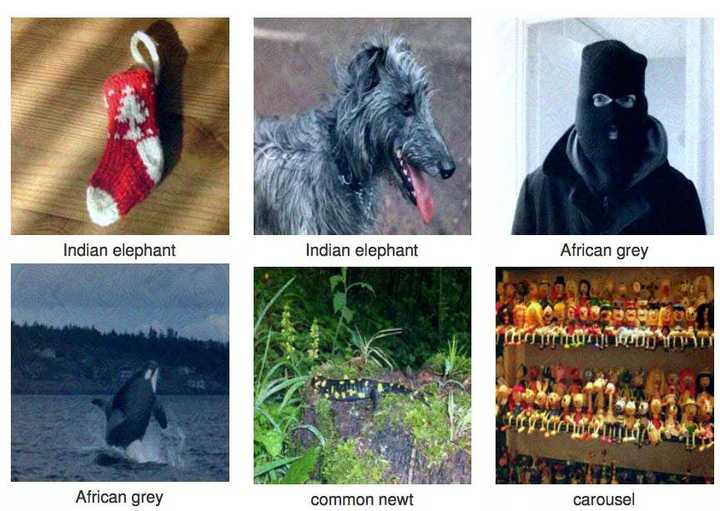 ▲ 一些被“扰动”过的图像(图源:Seyed-MohsenMoosavi-Dezfooli, Alhussein Fawzi, Omar Fawzi, Pascal Frossard),下面是AI识别的结果:两张亚洲象、两张非洲灰鹦鹉、蝾螈、旋转木马(也不是……那么难以理解吧……硬要联想的话)