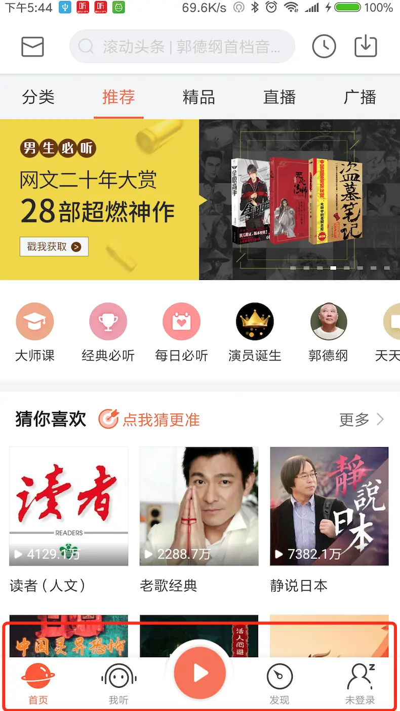 底部栏的实现 对于这种底部Tab栏,大家应该再熟悉不过吧?那么中间这个突出来的播放按钮应该怎么实现呢?有的朋友会说用一层帧布局FrameLayout或者相对布局RelativeLayout作为外层,然后里面再嵌套一层线性布局LinearLayout,把其它部分的背景颜色设置成透明不就可以了。这样做其实是可以的,只不过这边我想带给你一种更加省时省力的方式,就是clipChildren这个属性的应用。