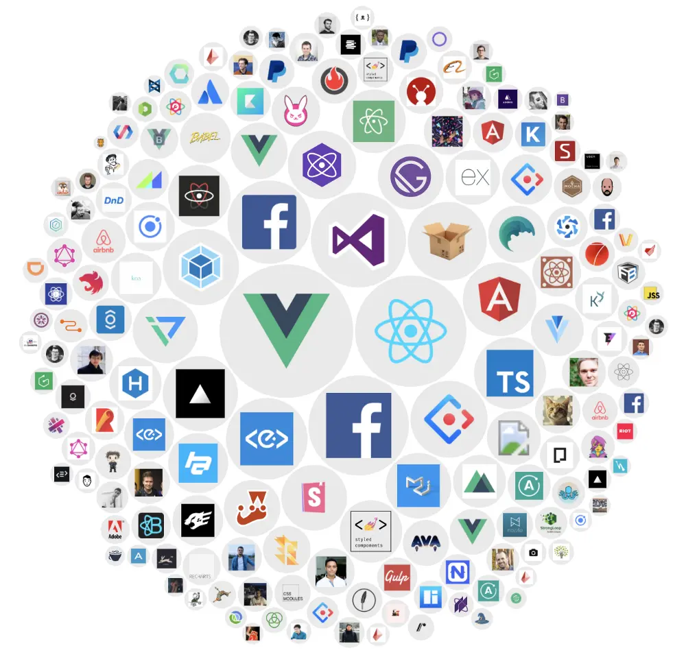 虽然react点赞增加速率不很快(对于一个老项目来说,我们应该满足),但是react的成功更倾向于看他的生态圈,如下图: