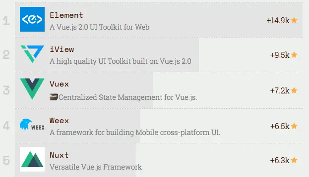 这并不代表是最受欢迎项目,在项目总的点赞数量上依旧是react(86102 stars),但是确实是增长速度最快的,如果按照这个速率,接下来有可能会超过react。