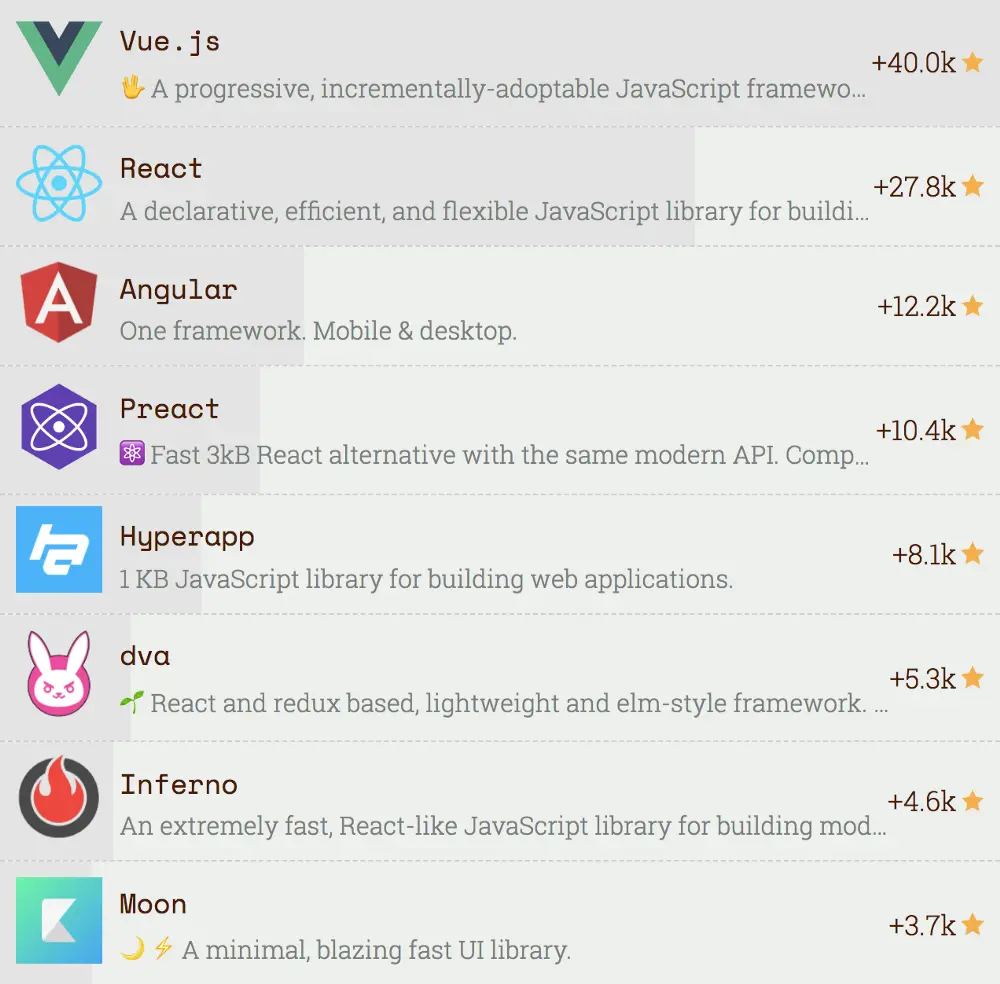 位列前三的框架(Vue、React和Angular),还有一些更小的框架比如preact(这个在react许可证闹剧的时候听说),还有一些自己没有接触没有用过的(Hyperapp、dva等)。